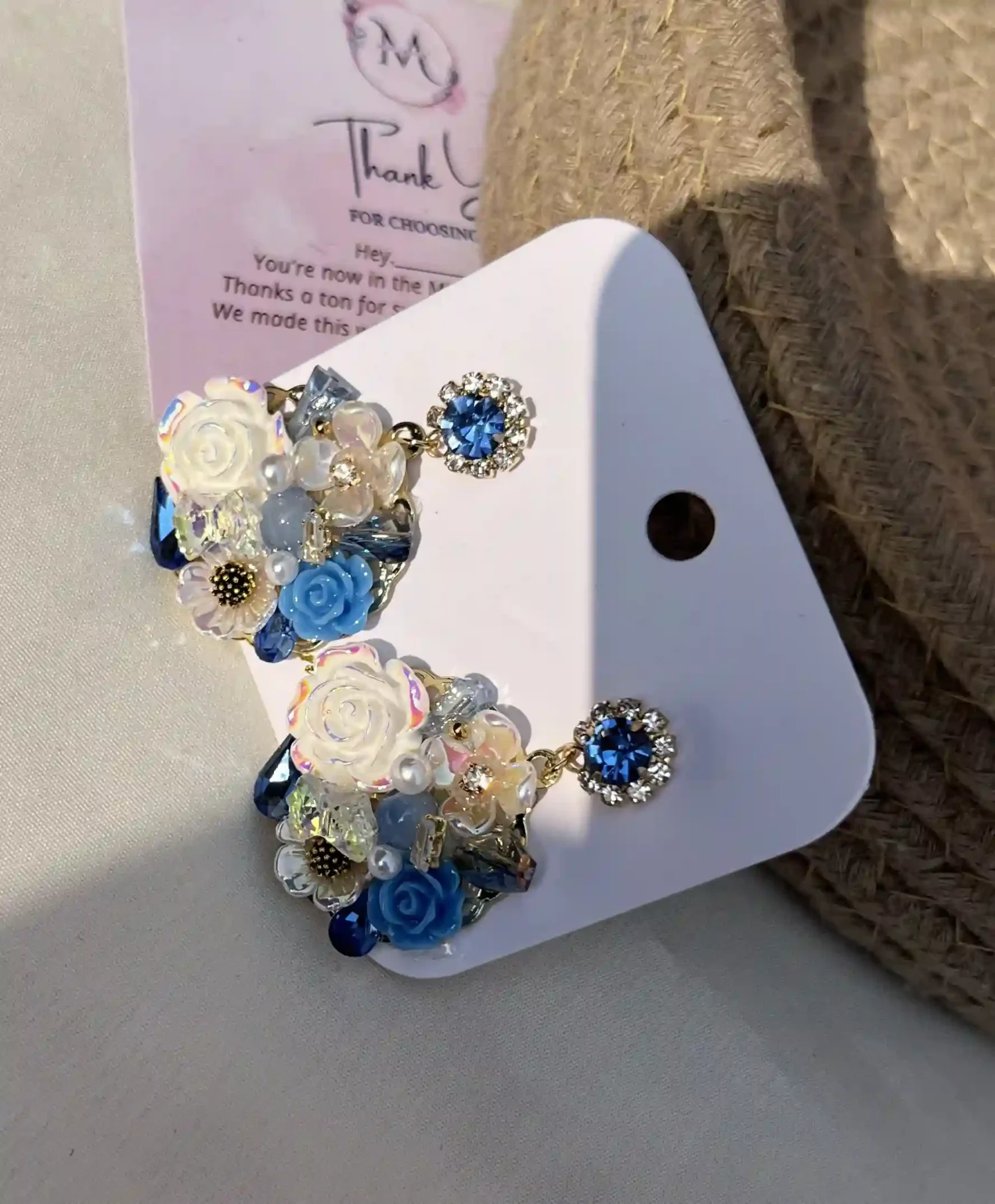 Cool, elegant, and eye-catching, the Korean Bluebell Rose Garden Earrings bring a fresh floral statement to your accessory collection. Designed with bluebell-inspired accents, ivory roses, pearl details, and shimmering crystals, these Korean earrings offer a refreshing blend of color and sparkle. The blue tones add a graceful contrast, making them ideal for evening events and special celebrations.