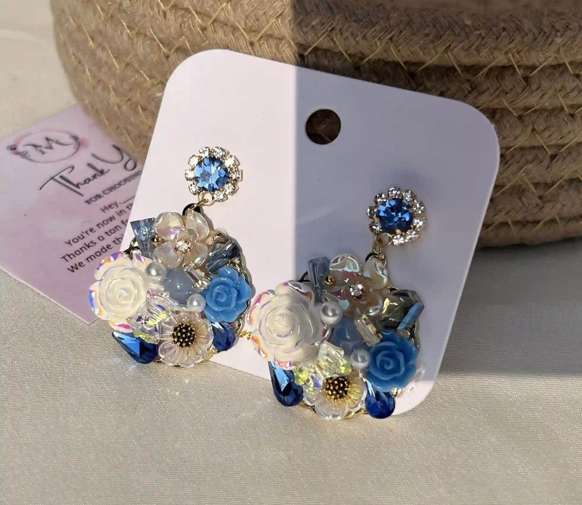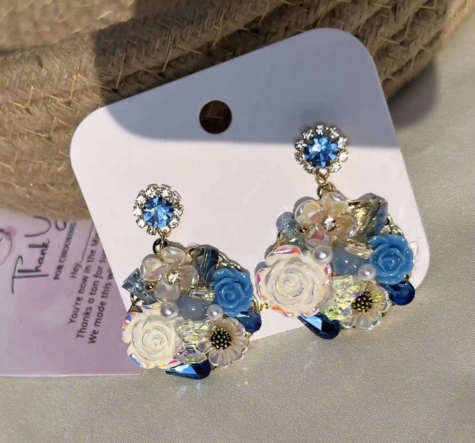 Cool, elegant, and eye-catching, the Korean Bluebell Rose Garden Earrings bring a fresh floral statement to your accessory collection. Designed with bluebell-inspired accents, ivory roses, pearl details, and shimmering crystals, these Korean earrings offer a refreshing blend of color and sparkle. The blue tones add a graceful contrast, making them ideal for evening events and special celebrations.