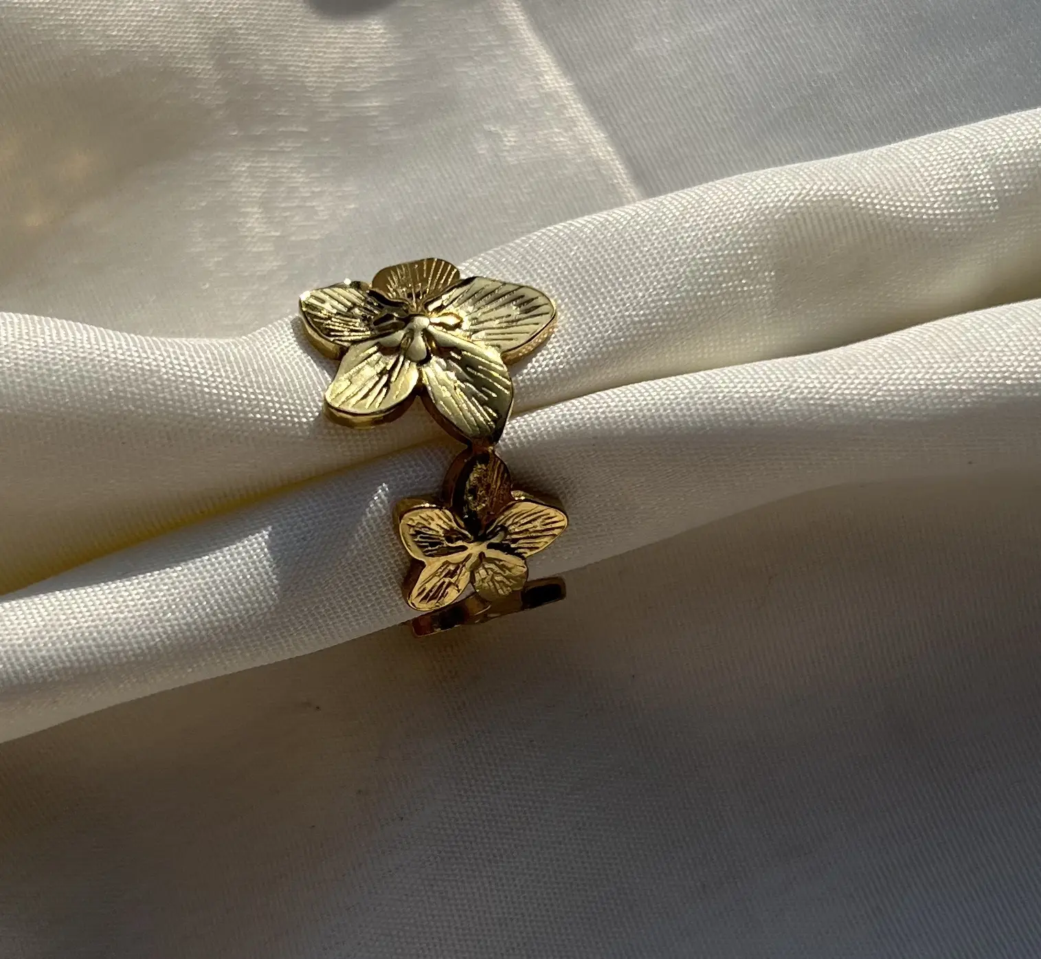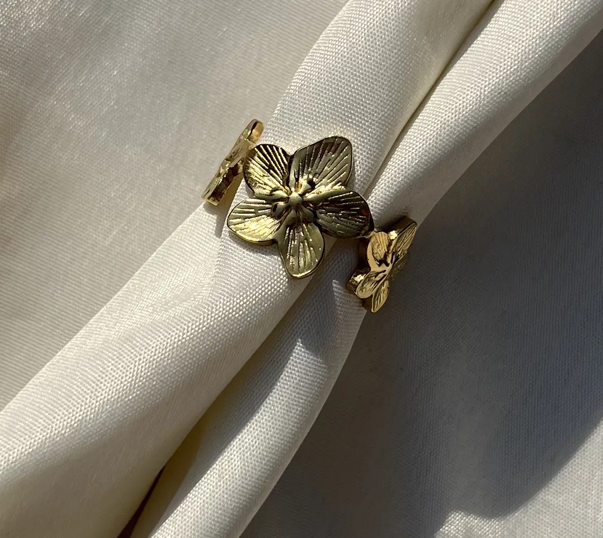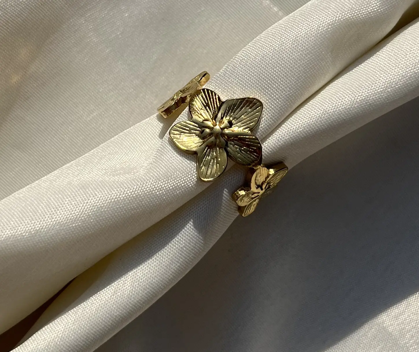 Make a bold impression with the Statement Petal Ring. Featuring a striking floral design, this gold-toned ring combines elegance with durability. Crafted to be anti-tarnish and water-resistant, it retains its radiant shine through everyday wear. Perfect as a statement piece, it can be worn solo for a dramatic effect or layered with delicate gold rings to elevate your style. A versatile accessory that effortlessly enhances any outfit, from casual chic to evening glam.